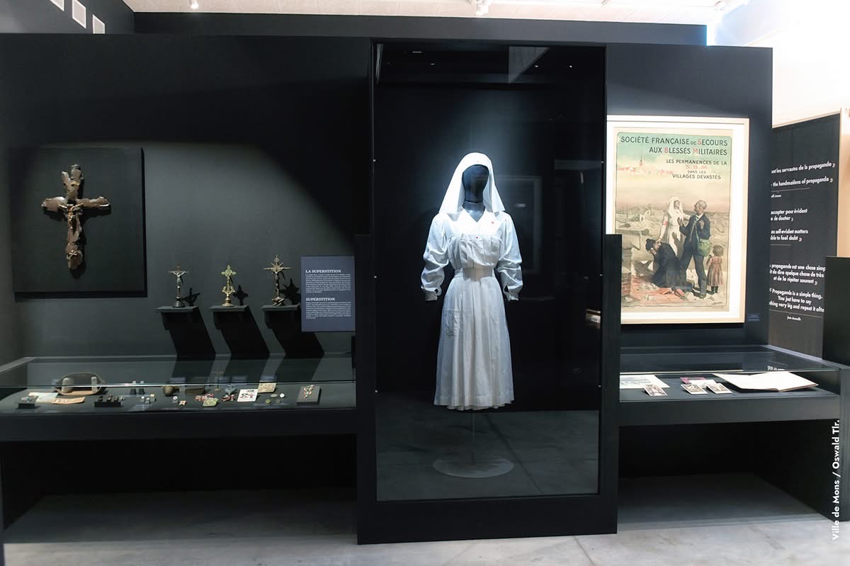 Nous avons accompagné le Commissariat scientifique et le Mons Memorial Museum pour mettre en récit une exposition aux forts échos contemporains qui part de cette légende pour interroger plus largement le phénomène des miracles et apparitions survenus durant la Grande Guerre ; aborder la thématique des pratiques religieuses et du besoin de croire en période de guerre ; et décoder les liens entre culture et propagande.